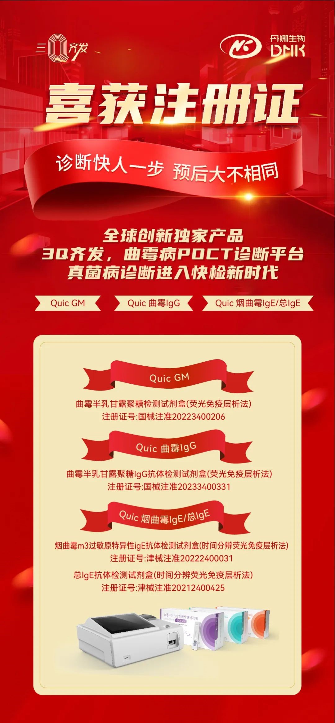 重磅!丹娜生物Quic 曲霉IgG喜获国家三类医疗器械注册证,3Q齐发,助力真菌快检新时代!